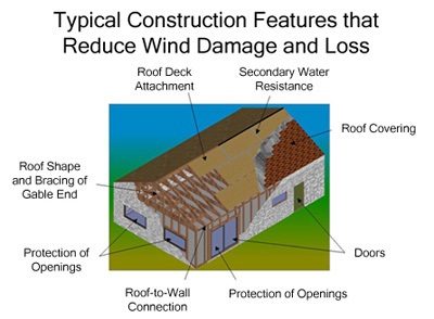 The diagram above shows features that reduce wind damage. The majority of existing houses have one or many wind-resistive construction features. These attributes may qualify for some insurance reductions. Also, houses built after 1994 in Miami-Dade or Broward Counties and houses built after 2002 in the rest of the state generally have many wind-resistive construction features and will more than likely qualify for money-saving credits.